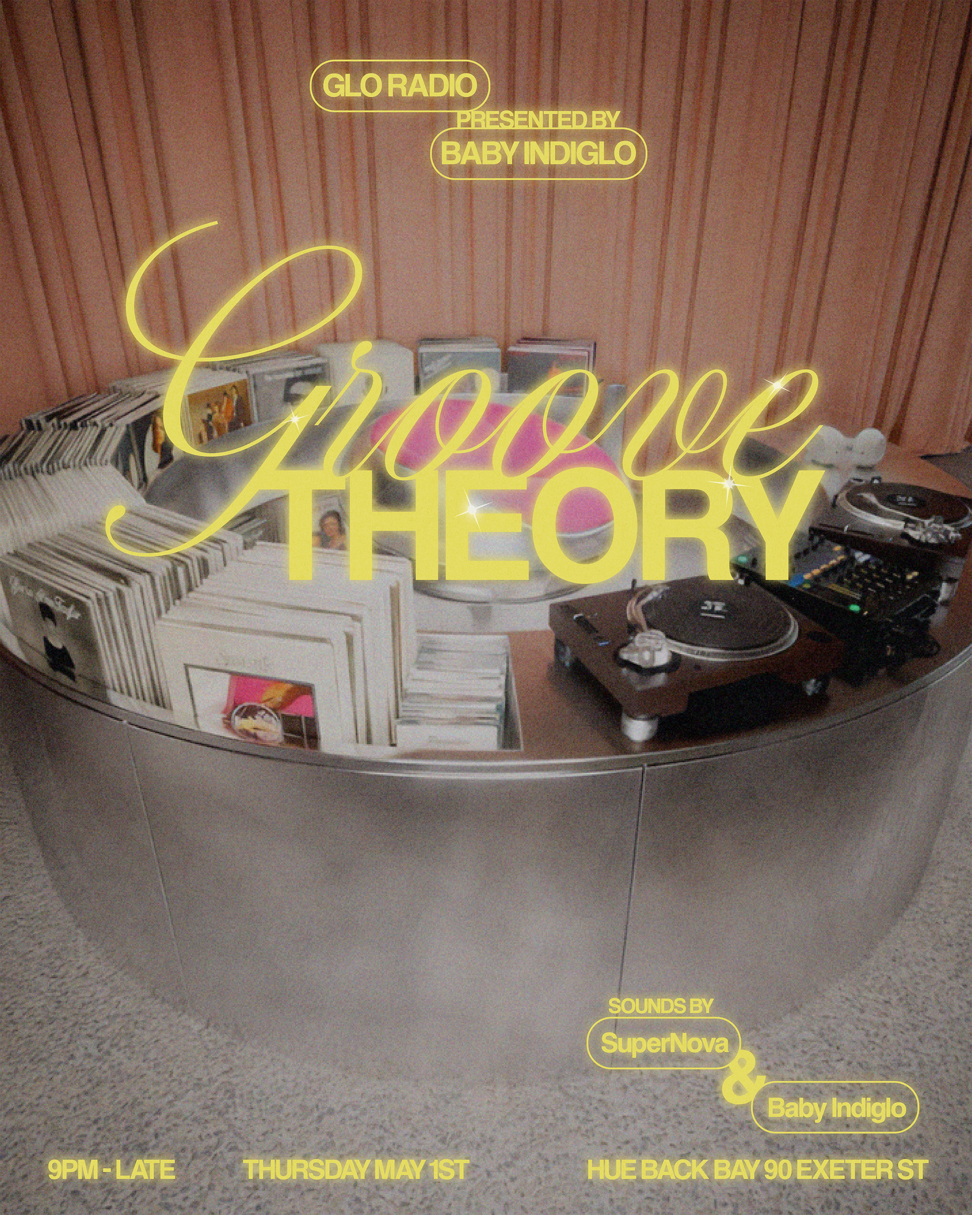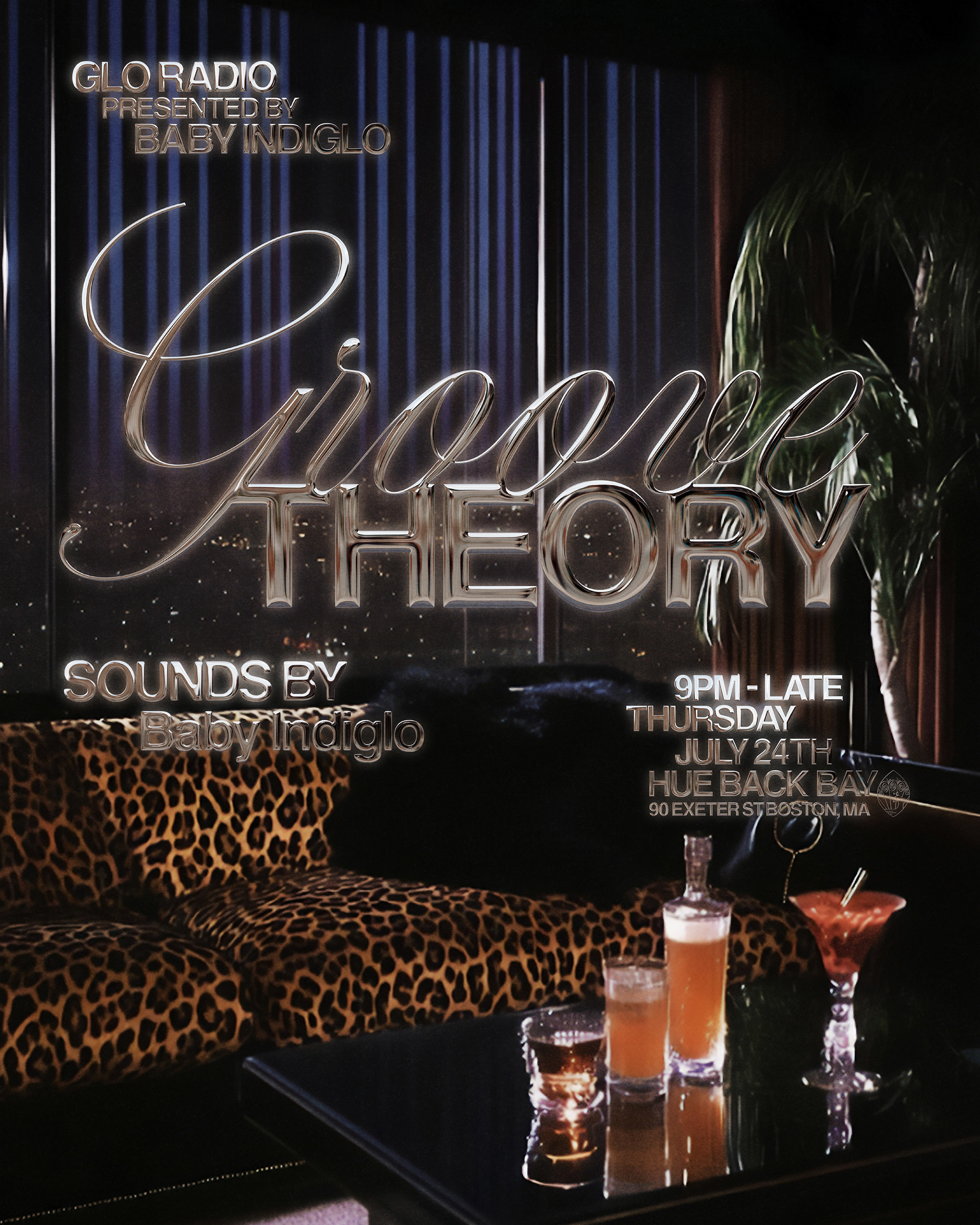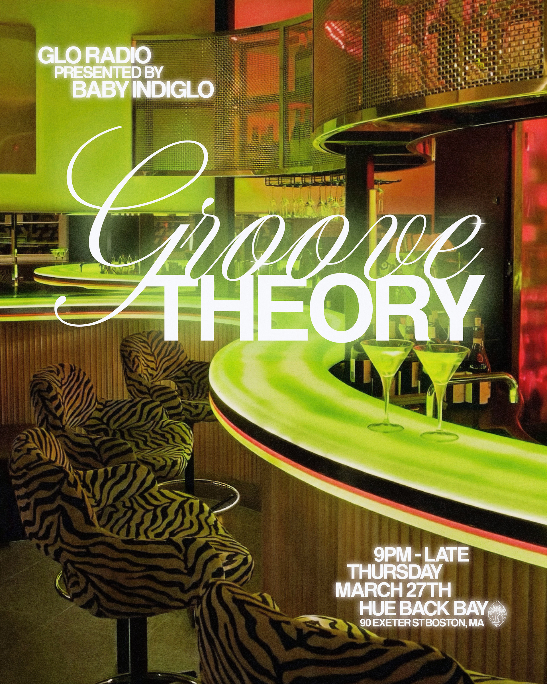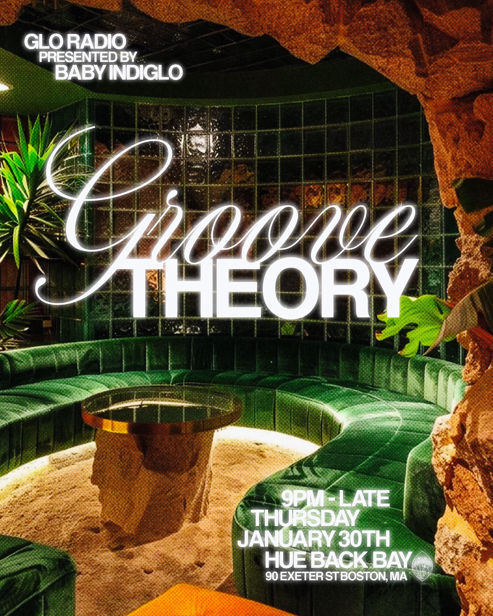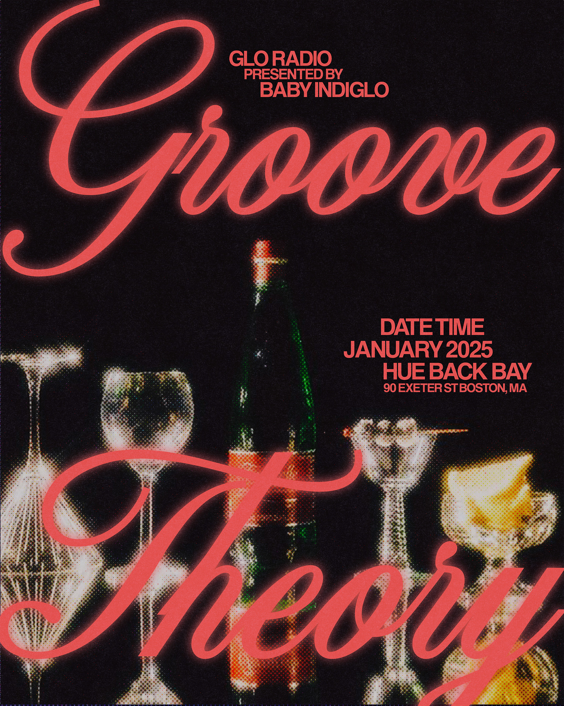 Graphic design and typographic logo for Groove Theory, a Boston-based party series. The project was inspired by lounge and cocktail bar aesthetics, R&B disco culture, and mid-century modern design blending rhythm, warmth, and a sense of intimacy. We developed a interlocked typeface logo that emphasizes connection and movement, referencing both the relationship between music and dance and the communal nature of the event. The typographic system was extended across a series of promotional flyers.